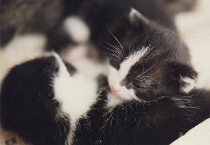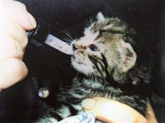 | TUBE FEEDING | The cleanest and most efficient method. Requires specialist equipment, training and technical skill. Useful if a kitten's "suck reflex" is poor or the kitten cannot suckle properly (e.g. cleft palate where surgical correction will be performed later). Stomach tubes must be soft, flexible, blunt-ended and no more than 2-3 mm diameter. Suitable tubes are: premature human baby feeding tube or soft urinary catheter of the right diameter. Syringes should be 2 ml for small kittens, 5 ml for larger ones. Measure the tube to the correct length (from the kitten's nose to just behind the point of the elbow), and mark the tube at this point. This measurement will change as the kitten grows! Lubricate the exterior (e.g. with KY jelly) before insertion. Open the kitten's mouth by pressing gently at the corners. Keeping the head flexed downwards, slide the tube along the roof of the mouth, over the back of the tongue and down the back of the kitten's throat into the oesophagus. Pass the tube down until the mark on the tube is level with the nose. The other end of the tube will then be in the stomach. If any resistance is felt, withdraw the tube gently - it may have entered the lungs! If you have a stethoscope, listen to the kitten's chest - wheezing or bubbling sounds means the tube has entered the lungs. A syringe containing pre-warmed milk can then be attached, and the milk can be delivered slowly to the stomach. Make sure that the syringe does not contain any air. Wait a few seconds before removing the tube. | The kittens have no control over how much they are fed and can easily be overfed or underfed. Kittens with a strong suck reflex are deprived of something to suckle. They may suck on each other and causeskin damage. Accidentally putting the tube into the lungs - this will cause drowning oraspiration pneumonia. If the kitten's head is kept flexed forward, it is quite difficult to miss the oesophagus or put the tube into the airway by mistake. Many kittens meow throughout the whole procedure - if they stop mewing the tube may be in the airway. This technique requires at least some training from veterinary staff. |