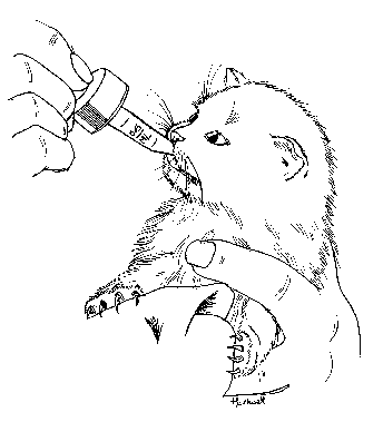 | BOTTLE (with rubber teat) | Baby bottles can be bought which are specially designed for kittens. The size of the hole in the teat (nipple) is important. Fill the bottle and tip it upside down - if it drips or dribbles freely, the hole is too large and there is a risk of drowning the kitten. Alternatively, if you have to squeeze the bottle hard, the teat is too small and the kitten will not get enough food (or may give up trying). It should drip when gently squeezed. As the kitten grows it will need a larger hole in the teat to deliver milk faster. Keep the bottle at a 45° angle. That helps keep the teat full of milk and not air. A feeding kitten should lie comfortably on its stomach or side. Gently lift its head towards the bottle. | The hole must be correctly sized to regulate milk flow. Over time, the teat will become worn and the hole enlarges; worn teats must be changed for new ones. Kittens may become fixated upon one particular teat (a scent association) and may be reluctant to feed from a replacement teat. |