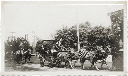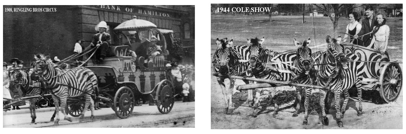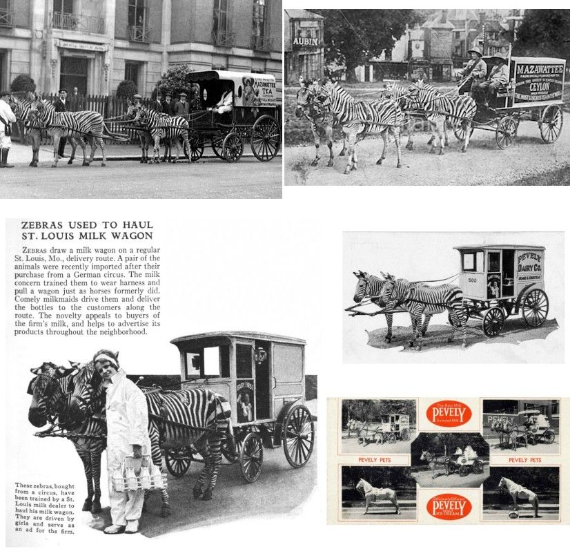 The top images show the Mazawattee Ceylon Tea Delivery Cart. The sight of a tea delivery cart pulled by 4 zebras would certainly have stuck in the mind and served as good advertising for the company. Images below those show the Pevely Dairy Company in St Louis also had a zebra-drawn delivery cart. The zebras were eyecatching and served as advertising.
