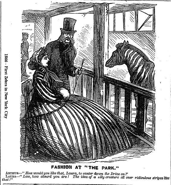 From 1866, a pithy comment about riding striped horses. This was the first Zebra in New York City.