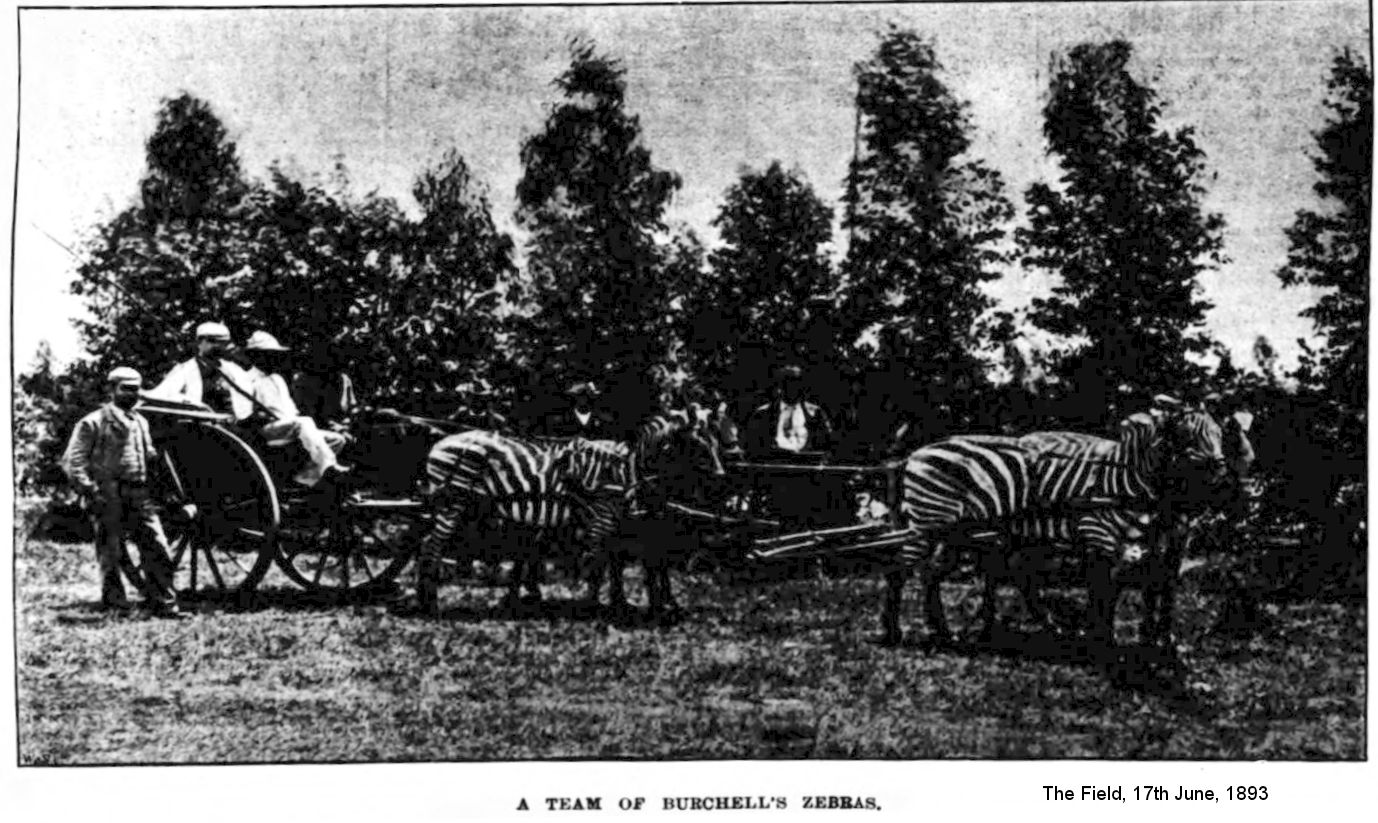WILD HORSES, ASSES, AND ZEBRAS. HYBRID EQUIDAE. By W. B. TEGETMEIER. (The Field, 17th June 1893) It is apparently only at the present time that the Cape colonists have arrived at the conclusion that Burchell s zebra is a desirable beast of draught and of burden. This fact, however, may be regarded as being very distinctly demonstrated. A number were introduced into Europe a short time since, and soon of these are now being driven, and, to show their docility, I have very great pleasure in reproducing the photograph to which I alluded last week, showing four Burchells driven in a four-in-hand in a two-wheeled Cape cart. This demonstrates the fact that they can not only be employed in teams with other animals, as shown in the drawing in the Field of March 11, but that they can be used alone. Burchell's zebras are now on sale in the Cape at prices averaging about 10, and I know of an instance of an eminent zoologist entering into negotiations for the introduction of a number of Burchell's zebras, not for the purpose of exhibiting in zoological collections, but to demonstrate their utility as beasts of draught, to ascertain their prolificacy in this country with their own and other species, and their capabilities of adaptation to the conditions of life that here obtain.