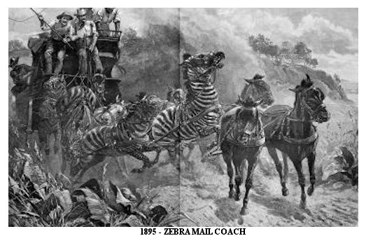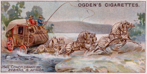 | A 1910 "Ogden's Branch of the Imperial Tobacco Co." cigarette card depicts a South African scene of a wooden mail coach drawn by six zebras crossing a river. The information on the back of the card says "The Mashonaland Zebra Mail Team. Owing to the horses and mules on the Mashonaland mail route in South Africa not being able to bear the unhealthiness of the climate, and dying in alarming numbers, zebras kicked and bit furiously, but soon became tractable in harness and pulled well together. A team is shewn as crossing a river near Fort Tuli." | This depiction shows a zebra mail coach pulled by a pair of mules and 4 zebras. | |