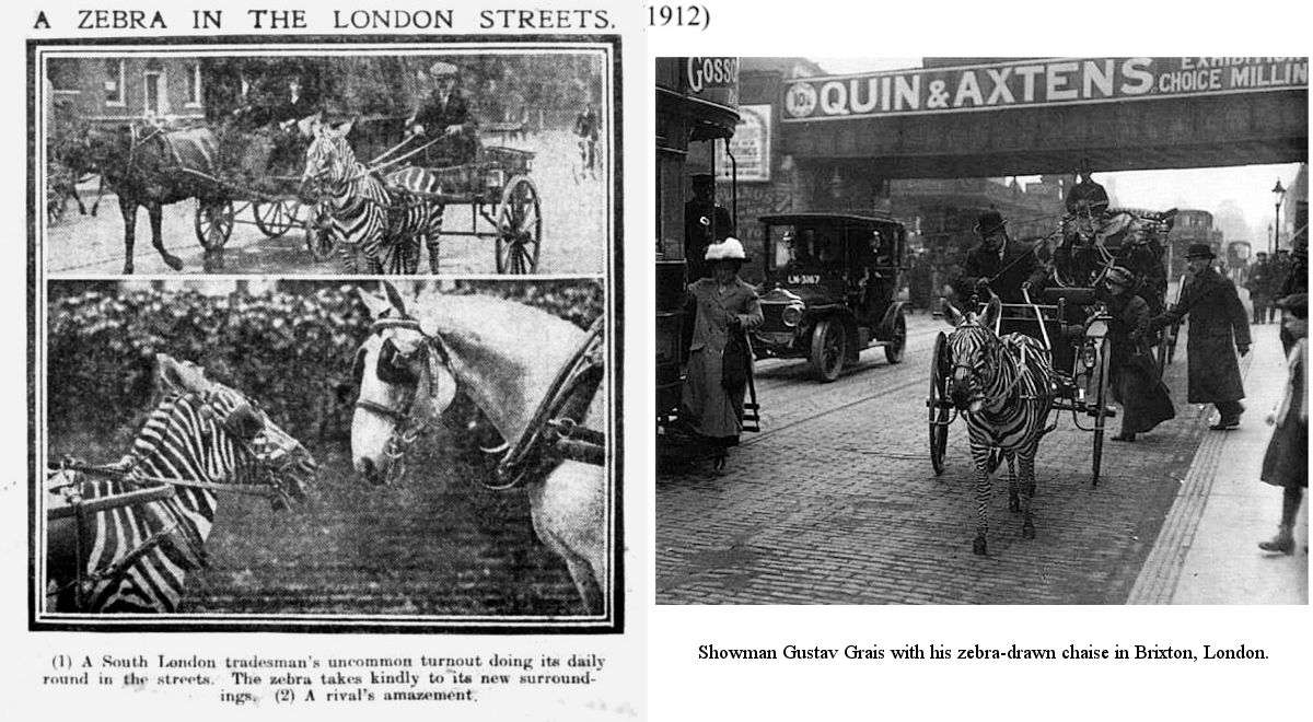 According to The Standard (London), 13th August 1912, "A zebra harnessed to a pony-chaise, seen driven along the side of Clapham Common. The zebra belonged to the music-hall artist, Mr Gustav-Grais. Having survived a fire it was stabled at Brixton and is seen here on its daily exercise route in South London" Gustav Grais was born Gustav Eichler in Marienburg West Prussia in 1860. When he settled in England, he changed his name to Grais. A showman and circus daredevil, he set up a circus of baboons and zebras.