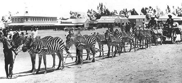 The 1900s photo shows a "savage" zebra being broken to harness at the Zoological Gardens (Horace Hayes). Zebras were not hard to break to harness or saddle, but they were more easily spooked than horses.