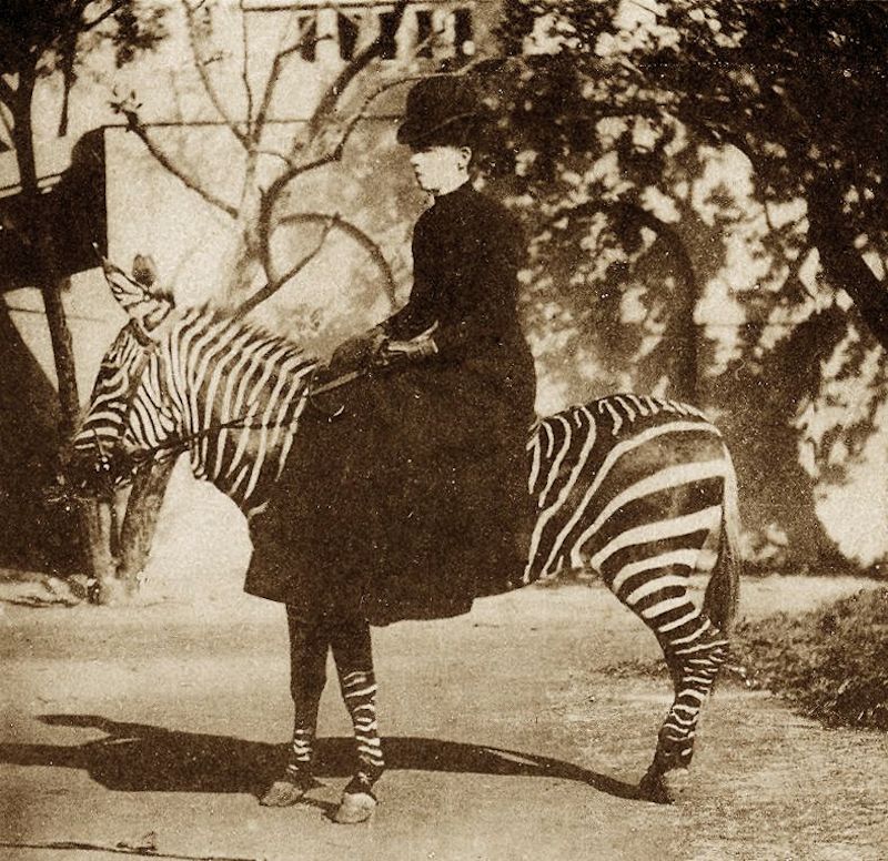 Originally published in 1877, Captain M (Matthew) Horace Hayes's "Veterinary Notes for Horse Owners"became the standard work on equine health care and, now revised, remains in print today. He also wrote "Among Men and Horses" (1894) and Illustrated Horse-Breaking (1905). Hayes was an army vet and he and his wife Alice travelled widely in the course of his work. Alice was an accomplished rider and the author of "The Horsewoman - A Practical Guide to Side-Saddle Riding" (1893, 1903) edited by her husband. She rode a variety of difficult horses, so it's no surprise that she rode zebras (broken by Horace). In "The Horsewoman" she wrote "RIDING DIFFICULT HORSES. - General Remarks Shying Stumbling Dancing and Prancing Throwing up the Head Habit-shy Jibbing Shouldering Backing Pulling Refusing Boring Kicking Buck-jumping Rearing" and went on to describe the zebra under the heading "KICKING.":