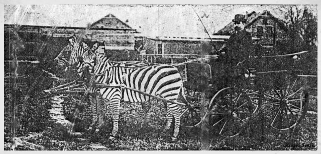 Pretoria, the capital of the Transvaal, is a very pretty little town situated about thirty-five miles to the north of Johannesburg, and, as the sittings of the High Court are held there, it was not long before I found myself, in company with others, journeying towards it in a coach and ten horses, the usual method of travelling out here. Mr James Zeedesberg, whom I met by appointment the next afternoon, told me that his firm about two months ago bought eight half-grown wild zebras from a hunter named Groblaar. Groblaar caught them in a wild state between four and five months ago by riding after and lassoing them. During the last month they have been in training for harness, with the result that four of them are perfectly quiet and well trained, and the remaining four partially trained. The place where they are located is at the station in Petersberg, in the district of Zoutpansberg, Transvaal. It appears they are a little timid at first when the harness is being put on; but afterwards they are all right, and Mr Zeedesberg believes in a month or two's time they will be as steady as horses. They pull well and are very willing, and never jib, a vice which is very prevalent in the horses of this country. In fact, one of them will do his best to pull the whole coach himself.