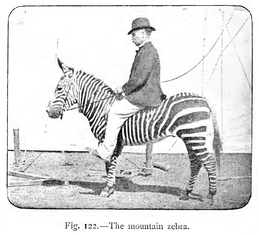 "Captain Horace Hayes, the well-known authority on equitation, made some experiments on the Grevy zebras in the Zoological Gardens to show the efficacy of his method in breaking them to harness. The animals selected were a nine-year-old mare called "Jess," and another younger and far more tractable animal. After some preliminary stroking with a pole about the mane and ears, a halter was got on, and the animal under treatment was allowed to pass from the box into the paddock. At this stage Jess became excited, rushed violently to and fro, and cut her forehead against the enclosure. The further process of taming consisted in hobbling one of the forelegs, while also restraining the use of a hind leg so as to render her helpless, in which state she was gently thrown and bitted, the bit being covered with gutta percha. She was then driven by Captain Hayes, and ridden by one of the attendants, appearing to be quite manageable in her new capacity. The other mare gave very little indication of spirit of any kind, save a tendency to kick when on the ground. No violence was used, and the effect would seem to be produced by the shock to the animal's nerves caused by throwing it with hobbled limbs. It should be remembered that these zebras were in poor condition, and to a certain extent domesticated by having lived under artificial conditions. The task would, of course, be more difficult with one fresh from its wild life. The Franciscan Sisters on their way to Uganda witnessed attempts on a large scale for the capture and taming of zebras in East Africa, but we do not know what success attended them. One of the great incentives to the experiment is the immunity of the zebra in its wild state to the bite of the tsetse, although it has not been ascertained whether this valuable quality will survive under domestication. Another motive for taming the zebra is the desire to preserve so beautiful a creature from extermination, which will certainly be its fate within a very few years, unless it can be successfully reared in captivity. It must either serve man in some capacity or disappear before his advance into its haunts in the African wilderness. Its South African congener, the quagga, is already gone, with many other beautiful and interesting forms of life that swarmed on the veldt before the advent of the white man his destroying rifle."