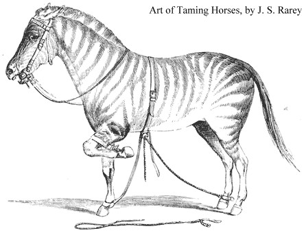 According to "A New Illustrated Edition of J. S. Rarey's Art of Taming Horses," "For conquering a vicious, biting horse, there is nothing equal to the large wooden gag-bit, which Mr. Rarey first exhibited in public on the zebra. A muzzle only prevents a horse from biting; a gag, properly used, cures; for when he finds he cannot bite, and that you caress him and rub his ears kindly with perfect confidence, he by degrees abandons this most dangerous vice [...] If he is a violent, savage, confirmed kicker, like Cruiser, or Mr. Gurney s gray colt, or the zebra, as soon as he is down put a pair of hobbles on his hind-legs, like those used for mares during covering. (Frontispiece of Zebra.) [...] When you have to deal with a horse as savage a kicker as Cruiser, or the zebra, a horse that can kick from one leg as fiercely as others can from two, in that case, to subdue and compel him to lie down, have a leather surcingle with a ring sewed on the belly part, and when the hobbles are buckled on the hind-legs, pass the ropes through the rings, and when the horse rises again, by buckling up one fore-leg, and pulling steadily, when needful, at the hind-legs, or tying the hobble-ropes to a collar, you reduce him to perfect helplessness; he finds that he cannot rear, for you pull his hind-legs or kick, for you can pull at all three legs, and after a few lessons he gives in in despair. [...] These were the methods by which Cruiser and the zebra were subdued. They seem, and are, very simple; properly carried out they are effective for subduing the most spirited colt, and curing the most vicious horse." |