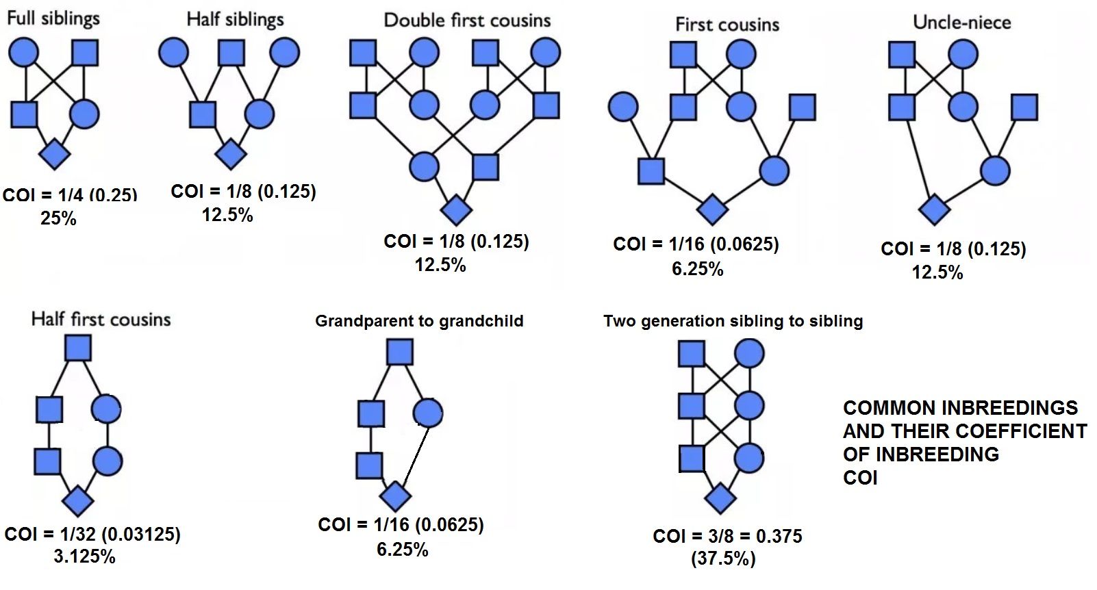 Inbreeding is measured and expressed as the Coefficient of Inbreeding (COI) on a scale of 0 to 1. It is widely used in breeding domestic animals, both pet-stock and farm livestock. A COI of 0 = no inbreeding; a COI of 0.25 = 25% inbreeding (typically brother-sister) and a COI of 0.01 = 1% inbreeding. In livestock and pet breeding, “inbred” refers to severely inbred animals with a high COI.