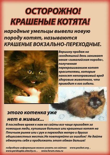 In 2018, I found more information from a Russian source. About 20-25 years ago, when the Moscow Bird Market was still at its old location, there were often “designer” kittens such as these sold there. Needless to say that most of these kittens died of poisoning from the substances used to lighten their fur. After 2 or 3 days their organs failed, but they were novelties and were, unfortunately, popular.