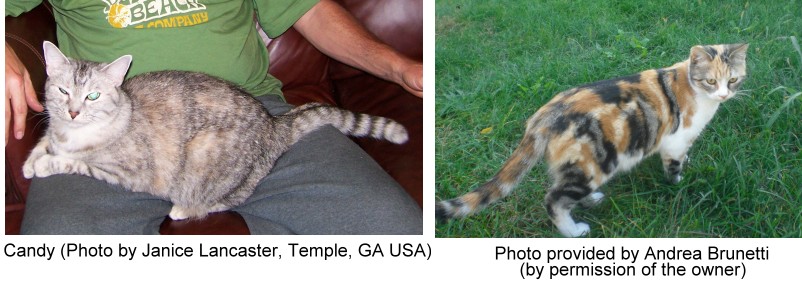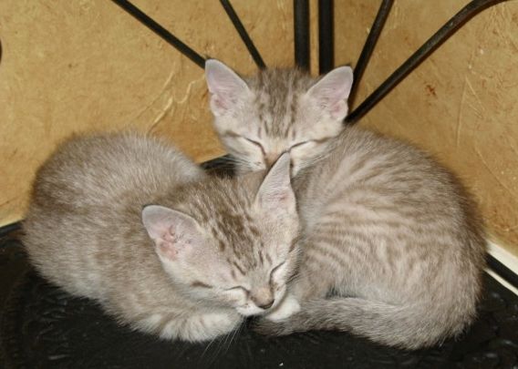 Some colours are simply unexpected in random bred cats as they involve recessive genes. There's an example near the top of the page showing a chocolate smoke kitten. Anastasia Thormahlen sent me this photo of Jaylin and Jamie. They are female mackerel tabby kittens from a litter of five kittens at Abandoned Animal Rescue in Tomball, Texas. Two other kittens were red-and-white and the fifth was white. Jaylin and Jamie appear to be either cinnamon or cinnamon-silver (any undercoat is hard to determine from photos alone), colours found in several pure breeds, but rarely seen in random-bred cats.