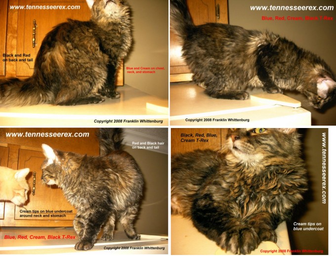 The texture of the fur can add to the difficulty of identifying colours. As well as the wide-band gene, the Tennessee Rex (bred by Frank Whittenburg) has curly fur and the satin gene which gives a mother-of-pearl effect and modifies how the colour appears. The cat in the photo is a black/red tortoiseshell-tabby with the golden gene (tortoiseshell golden). The black areas are brown tabby with black markings. The red areas are red on cream. The breed has the wide-banding gene which affects the ticking of the individual hairs: this gives additional golden tones and golden-tipped blueish tones to black areas. The curly fur makes the undercoat more visible which further disrupts the coat pattern resulting in a multicoloured coat. The golden gene is carried by some cats with the silver gene (in this case the cat's mother was silver tortie-tabby-and-white and the father was a red golden).