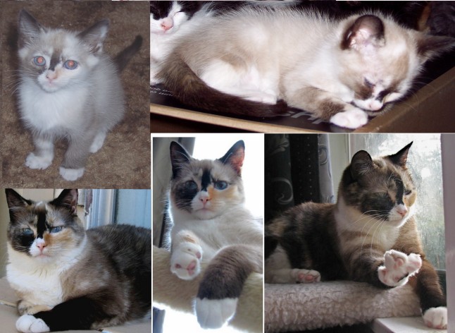 In the section above, the longhair colourpoint tortie clearly has a body paler than the legs, head or tail. Sometimes the contrast is less evident and additional clues are needed to properly work out the colour. Raimi Cyan Rayfield is an example of an more unusual colourpoint. Looking at her adult colours, it is not immediately obvious she is colourpoint because her body is only slightly lighter than her legs, tail and face. At first glance, she appears to be a tortie-and-white with some unusual coffee-coloured areas and blue eyes. Luckily we have some photos of her as a kitten and this gives more clues (Photos and information from Amy Russell, a cat foster parent for a non-kill shelter in Seattle, WA USA)..