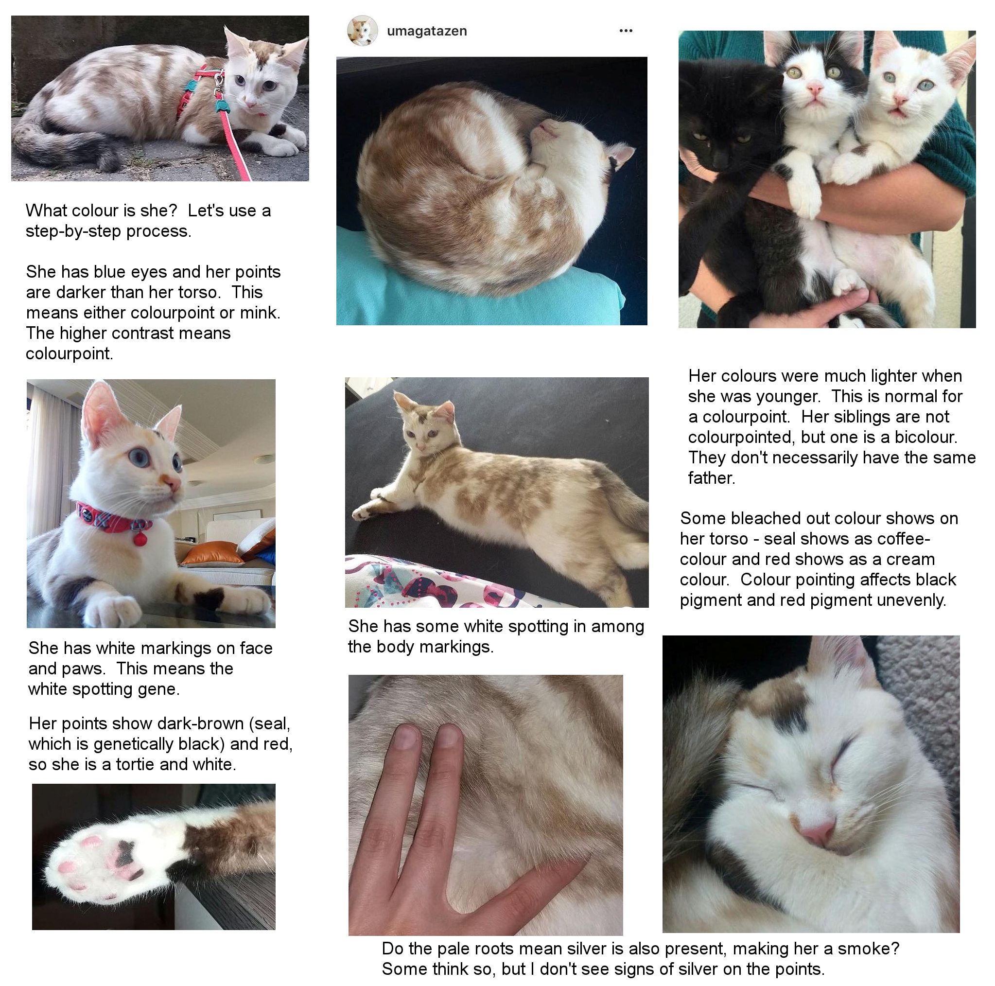 We also know that the silver gene can take the brightness out of red, turning it into a creamish colour. The fact that the siblings aren’t smoke doesn’t mean a lot when the parents are unknown (and they may have different fathers). The best place to look for silver is behind the elbows, at the base of the ears, on the forehead and sometimes on the shoulders. The sides and back are the least clear places for silver to show clearly. Seal-tortie bicolour pointed (possible seal-tortie-smoke bicolour pointed) seems the most logical explanation for the pattern on this cat, but personally I believe the body colour can be explained without the silver gene being present and simply due to the effect of the colourpoint gene.