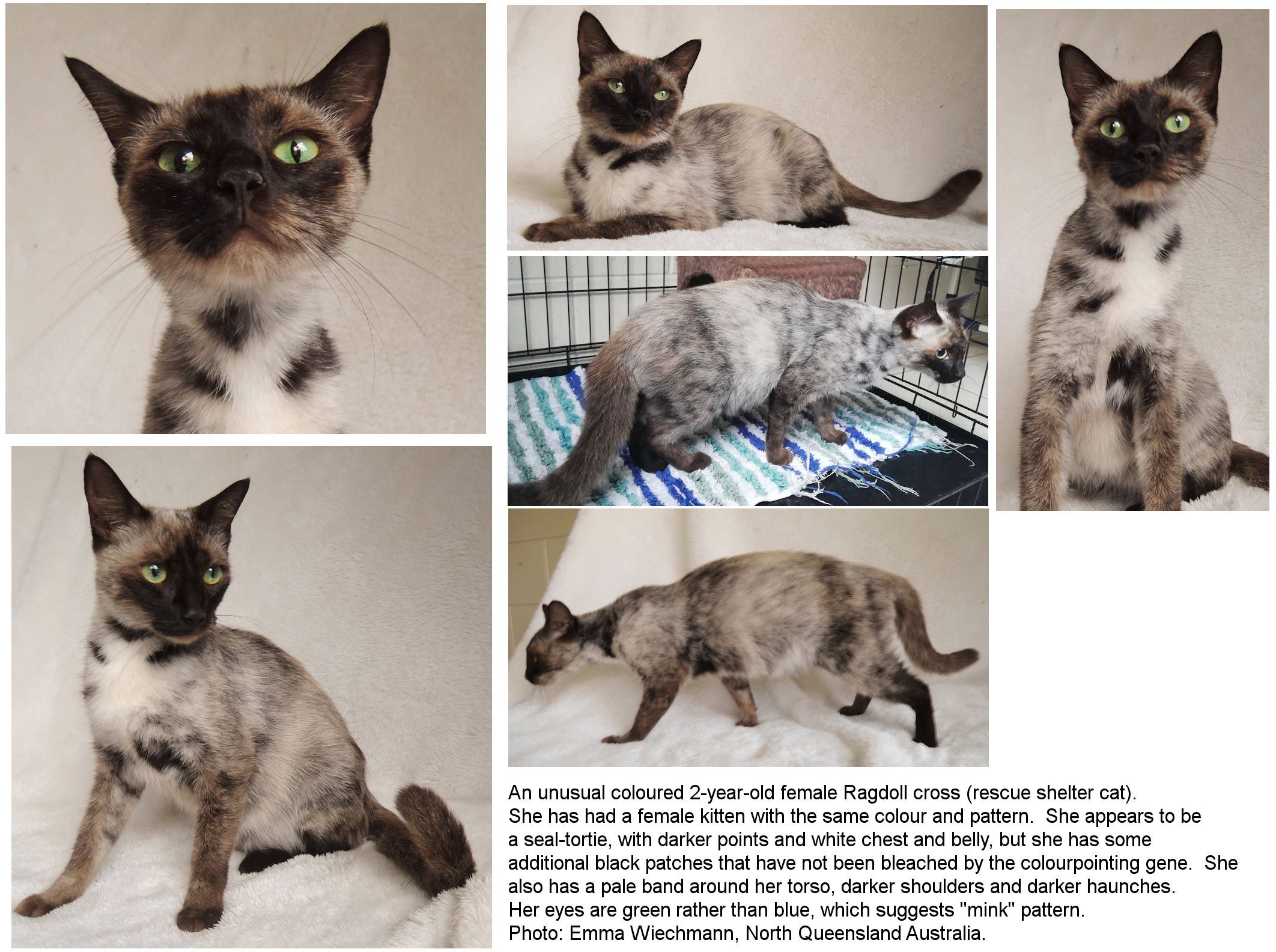 Emma Wiechmann, who runs a small cat shelter in North Queensland Australia, sent me these photos of an unusual coloured 2-year-old female cat in 2019. She is a Ragdoll cross and has had a female kitten with the same colour and pattern. She appears to be a seal tortie point or seal tortie mink with very little red marking on the legs and tail, but with a red chin. On the body, the colours are more intermixed so that the red colour is more “bleached out” pointing gene(s) than the black colour. The black markings the chest are unusual though. She also has green eyes, rather than blue eyes, which also points to mink. The fact she has had female kittens of similar colour also suggests tortie. Mink pattern occurs when a cat inherits one colourpoint gene and one sepia (Burmese-point pattern) gene and these interact to give a low-contrast pointed pattern with aqua or greenish eyes.