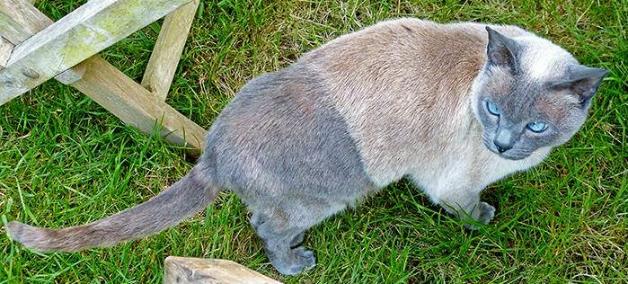 The formation of the Siamese pattern depends on temperature. That's why Siamese from hot climates have paler bodies and less colour at the points. Siamese from coller climates have more pigment on the points and darker bodies. If an area of the body is shaved e.g. for surgery, that area may grow back darker than ity was before. This is because the bare skin is cooler. This is also why some owners of exhibition colourpointed cats ask their vets to do a midline (abdominal) spay rather than flank-spaying - the flank-spay could cause a darker patch until the next moult. This Thai Bluepoint shows the temperature dependent effect clearly. He suffered an injury to his legs and hind end and needed surgery. Where fur was shaved from his lower back, it has grown back the same colour as the points rather than the same colour as the body. The fur should normally revert to the correct colour following one or two moults.