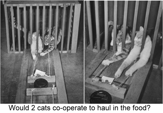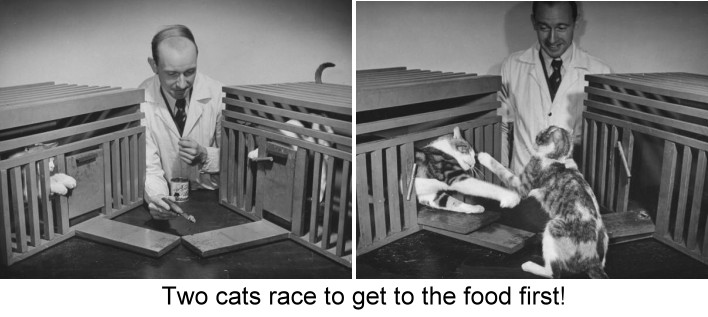The following series of photos are from psychological testing of cats at brooklynCollege in the early 1940s. The show cats learning to open the puzzle box to get a food reward. In one experiment, 2 cats co-opearted to haul the food towards them. In another, the cats competed to get to the food before the other. And finally, a kitten learns to navigate a maze.
