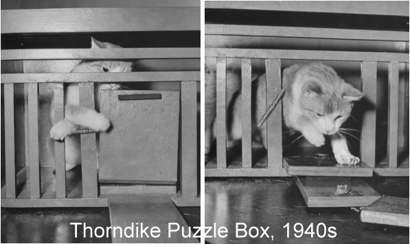 Some puzzle-boxes were quite complex. One latch required a simultaneous lift and push, and in other cages two or even three latches had to be opened in the correct sequence. Not all cats mastered these, but some did. The skills were gained gradually and Thorndike concluded "The gradual slope of the time-curve, then, shows the absence of reasoning. They represent the wearing smooth of a path in the brain, not the decisions of a rational consciousness." This is a generalisation as some cats improved abruptly and made no further mistakes even if months elapsed between tests. We describe the abrupt improvement as "the penny has dropped" or "something has clicked". One of my cats, Affy, was almost impossible to litter train despite 18 months of effort. One day she watched another cat using a litter tray and "the penny dropped"; from then on she used the litter tray (she had also learned through observation, something I'll look at later in this article).
