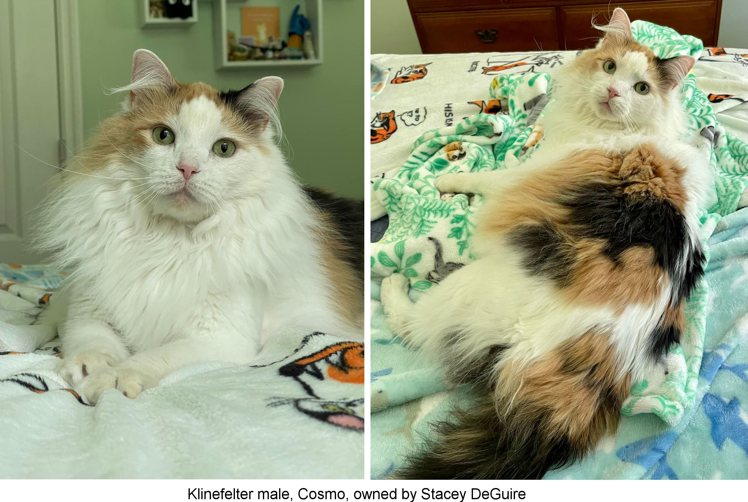Stacey DeGuire's male calico, Cosmo (aged 5 years old in 2022) is believed to be an XXY male by both his regular vet and his specialist due to his history of health issues. He also has an autoimmune disease for which he takes Prednisolone and has been quite stable for a while now. Each time his autoimmune disease flares up it presents differently: arthritis, gastrointestinal problems, or seizures, along with a high fever, anaemia and high white blood cell count. He is now doing well on a quite low dose of Prednisolone and has been stable for a couple of years now. Stacey though she was going to lose him in 2018 when he became very ill, but after several tests and emergency vet trips, they were able to rule almost everything else out and his specialist diagnosed him with autoimmune issues.