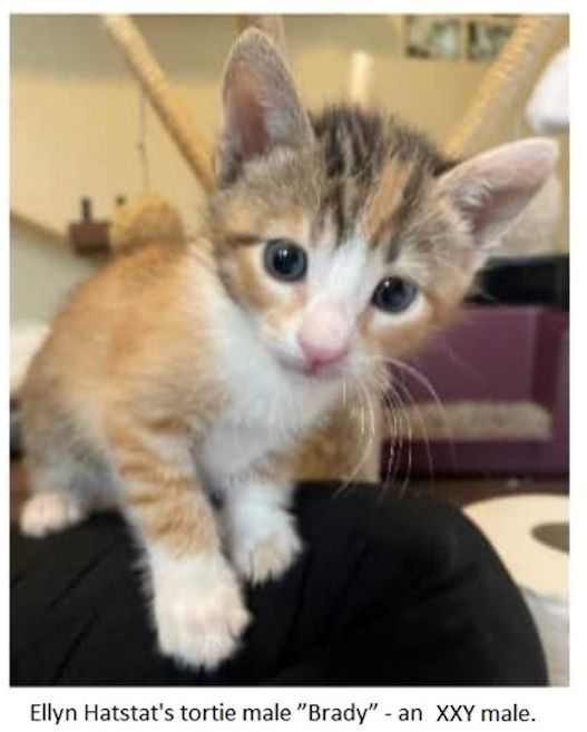 In 2022, Ellyn Hatstat received the Karyotype results back for her tortie male "Brady" and he was 39.XXY (Klinefelter) which is comparatively rare compared to chimerism.