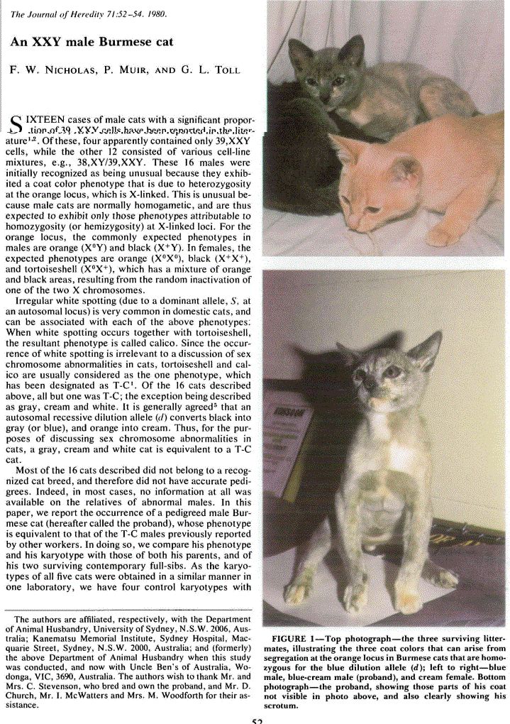 In the following issue, Julia May tried to correct that misconception. She described chimeras and skin cell somatic mutations (although she didn't use those terms). It's a pity that too few seemed to take notice and that the myth of tortie male = Klinefelter persisted for so long on the basis of An XXY male Burmese, Journal of Heredity 71: 2-54, 1980 (F W Nicholas, P Muir & G L Toll). That scientific paper mentioned 16 tortoiseshell male cats, 4 of which tested as 39,XXY and 12 tested as 38,XY/39,XXY mosaics.