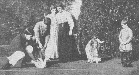 "A menagerie race in a garden" This image from 1909 shows a popular pastime (for well-to-do children at least). The little girl has harnessed a white Persian kitten with ribbon. The captions read: "One of the best methods of brightening up a dull afternoon is to hold a menagerie race. First of all we must collect the animals and birds, such as cats, dogs, rabbits, or fowls, that are to take part in the race, and harnessthem with string, as shown here, so that we can drive them. There need be no cruelty of any kind. As a rule the animals will go anywhere but in the right direction, which causes a great deal of laughter."