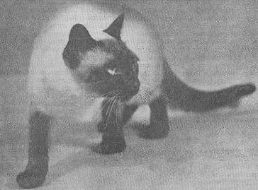 [A photo caption reads: The Siamese cat is quite different from all other domesticated cats, and it is very probable that it comes from a different ancestry. It has blue eyes, and a coat of a fawn shade, with dark brown face, tail, ears and legs. In spite, however, of these varied shadings in the adult, Siamese kittens are white.] The appearance of the Siamese cat is quite as striking as its ways. Its coat, which is very short and somewhat woolly, is of a pale fawn or cream colour, while its face, legs and tail are a dark chocolate brown. Its eyes are pale blue, and, to complete the picture, its long, thin, tapering tail usually has a decided kink, or a small bend, in it. In Siam the commoner native cat has a bent tail, and it is probable that the kink sometimes found in the royal Siamese has developed through cross-breeding.