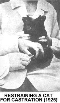 I believe that even for the minor operation on the male the cat should be anaesthetized. Some veterinarians dispense with it, but the British Animals (Anaesthetics) Act, which became a law in 1919 provides that a dog or cat over six months of age shall not be subjected to castration without being under the influence of a general anaesthetic. Dr. Hamilton Kirk, whose wide practice among small animals entitles him to speak, thinks there should be no age limit. There is of course the danger of death under the anesthetic, but it is better to run this risk, a very slight one if the anaesthetist is careful, than to subject any creature to needless pain.