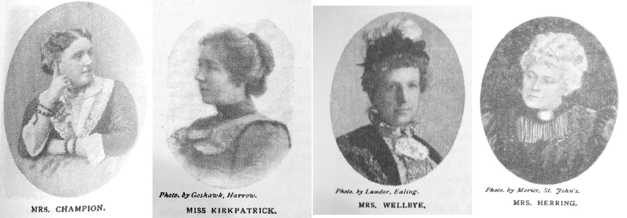 Vice-Presidents - Isabella, Countess Howe; Viscountess Maitland, Viscountess Esher, Lady Ridley, Lady de Trafford, The Hon Mrs Bampfylde, Lady Lister, Lady Gooch, Mrs Barnet, Mrs Alfred Bles, Mrs Walter Campbell, Mrs Chaine, Mrs George Dawkins, Mrs Cary Elwes, Mrs C Hill, Mrs King, Mrs Nicholay, Mrs Tottie, Mrs Peston Whyte, Lord Walter Gordon Lennox, A E Bateman Esq, Colonel Chaine, Henry King Esq.