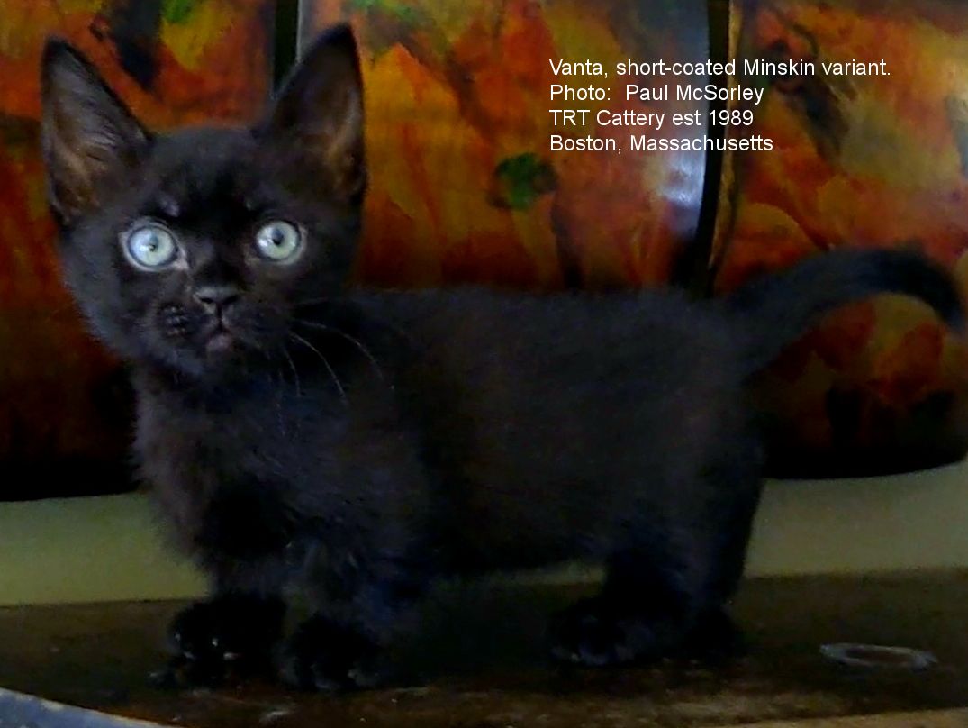 TRT Vanta, the short-haired Minskin variant shows an interesting trait in the breed - coarse hair in carriers of the fur-pinted trait. Panda (the black-and-white cat , top centre in collage) was the first coated Minskin carrying the fur-pointed trait related to Devon Rex and Sphynx Hairlessness, and she had noticeably coarse fur texture; not wire-haired, but definitely lacking in sheen and lustre. Her unusual "rough textured coat" was observed by TICA Judge and geneticist Dr. Solveig Pflueger. This "dull coat" was commonly seen in coated cats carrying the recessive gene for rex coat/fur-points. This was a good indicator for identifying which coated cats carried the recessive fur-pointed trait and would produce some fur-pointed kittens when bred together. It could also indicate which of the coated kittens did not have the recessive gene. This is important when outcrossing to American Burmese to widen the gene pool. The black short-coated kitten, Vanta, has the dull coat indicative of the presence of the recessive fur-pointed trait.