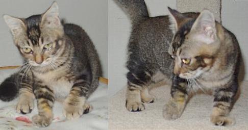 The following detailed account of a cat with a less benign form of achondroplasia (or mimic condition) is provided by Aimee Johnson in October 2003. Aimee has allowed me to use the information and photos to provided information other owners of similar random-bred cats. Unlike the apparently healthy Munchkins, "Tellie" suffers a number of health problems, some linked to his condition and others possibly due to inbreeding and birthing problems. At the time of this account, Tellie was four and a half months old.
