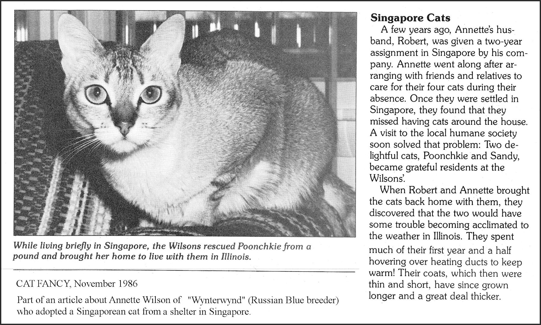 Since 1951, Leonhardt had been investigating the agouti pattern of both wild and domestic cats in East and South-East Asia, where she had spent some years. The the cats in and around Singapore, all of them Wild Abyssinians, [naturally occurring ticked tabbies] were well known to her, and she had published the results of her 50 years of research in "Edelkatze" in 2004 (reprinted in "Our Cats Annual" in the UK). It became clear that there was never a “Singapura cat” or a “Singapura neighbourhood”, not even in so-called pockets. When she had read Tommy Meadow’s first illustrated articles in the 1980s, she realized that only the Abyssinian/Wild Abyssinian could be responsible for the pattern, but it could not have produced the brighter coat colour or the head conformation. How could the breeder claim that such cats were found in Singapore, an area that Leonhardt had covered exhaustively from 1951 to 2006 in terms of cats, while Mrs. Meadow had been there for scarcely a year and “discovered” the Singapura. Leonhardt began to investigate.