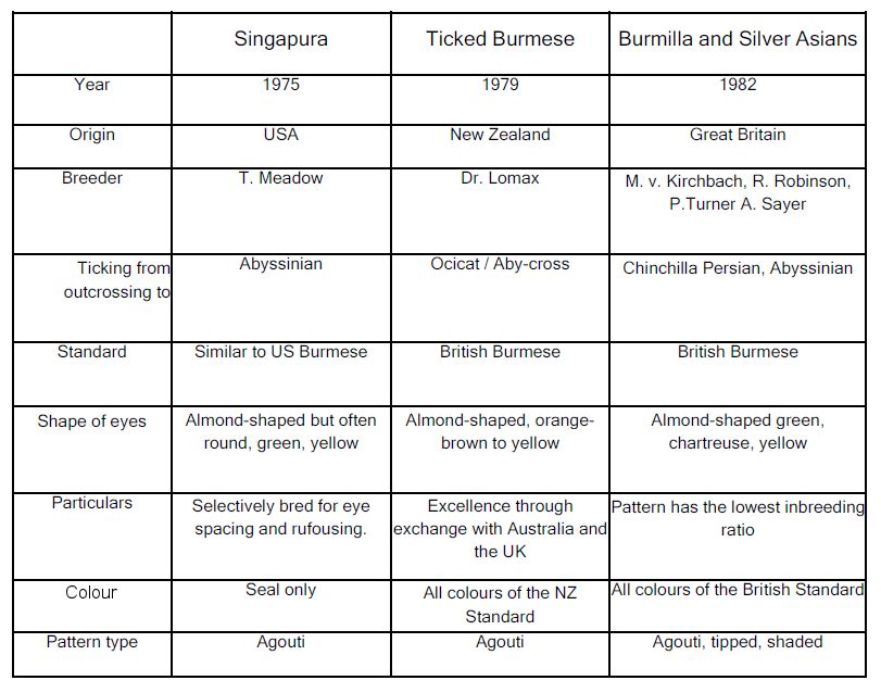 In the 1970s and early 1980s three different Seal Yicked Burmese arose with different names and slightly different standards. New Zealand had the Ticked Burmese (1979) originating which had used Ocicat / Aby crosses to introduce the ticking. Britain had the Burmilla and Asian Shorthairs (1982) from outcrossing to Chinchilla Longhairs and Abyssinians. The USA had only the Singapura (1975), found only in one colour and which Leonhardt suspected had used the Usual Abyssinian or “Wild Abyssinian” (ticked cats from Singapore). All conformed to their region’s Burmese standard for type.