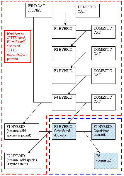 In the UK, the CITES import permit will be required for F1-F4 generations, but F5 and later generations can be imported as domestic cats. A Dangerous Wild Animals permit is required for keeping F1 hybrids of certain species. Unlike domestic cats, the imported F1 hybrids have to be quarantined in a zoo facility in the UK, they cannot be home quarantined by the exporter and cannot be quarantined in a cattery.