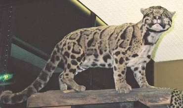 The Clouded Leopard is not a small cat, but the smallest of the big cats and different enough from other cats to have its own genus. It inhabits tropical rainforests in lower altitudes of southeast Asia and is arboreal. It has the body size and shape of a small cat, but the teeth and skull structure of a big cat. It is long-bodied and stocky with short legs, large paws and a thick, long tail almost as long as its body. It has a rounded head with a long muzzle. Clouded Leopards are brownish to rich gold in colour, marked with huge, dark blotches, hence the name "clouded" (the Latin name means "fogged"). The face has dark spots with two black bands running across their cheeks. The ears are short and rounded. Unusually for a cat, the pupil of the eye is oblong rather than slitted or rounded. They have the longest canine teeth relative to body size of any living cat with a large gap between the canines and premolars to enable them to take large bits out of their prey. It is an opportunistic feeder, taking monkeys, orang-utans, deer, wild pigs and fish. Prey is ambushed; the Clouded Leopard hangs from trees by its hind legs falls on it. On the ground, its short legs make it rather clumsy.