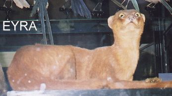 The Jaguarundi ranges from the coast of Mexico, throughout Central America, northwest Argentina, Peru and Paraguay with a small population as far north as Texas, USA. They inhabit lowland areas: swamp, forest and scrub and avoid the open countryside. Its name is from the German for weasel-cat, referring to their otter-like appearance. The Jaguarundi has an almost round head, small semi-circular ears, round eye pupils and short muzzle. It has a long body, short stocky legs and long, slender tail. The fur is short and sleek, ranging from greyish to reddish brown. It is unspotted. There are two colour phase: the greyish phase was known as the Jaguarundi, while the reddish phase was known as the Eyra and believed to be a separate species. The round eye pupils suggest common ancestry with big cats. It mainly hunts during the day and takes small mammals and birds (including domestic poultry), supplementing its diet with fruit. Despite its low-slung build it is an agile cat; it is mostly terrestrial but will climb trees. For centuries, they have been tamed and kept as pets by native South Americans, when content they will purr and chirrup. It is currently in decline, possibly due to habitat loss or because they frequently prey on poultry.
