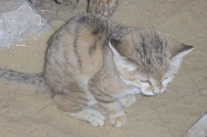 The Sand Cat inhabits the arid regions in the Middle East. There are five distinct populations: two in the Sahara desert of northern Africa, one in southern Saudi Arabia, one around the Caspian Sea in Russia, and one in Pakistan. It is a very small, short-legged cat with a very large wide head, and huge low-set ears. The dense soft fur ranges from sandy to light grey, with bands of dark brown to black around the leg, dark mascara lines and black tabby markings on the face and body. The pads of the feet are thickly furred to protect against hot sands. It is nocturnal and its large ears, which aid cooling, enable it to locate prey. Prey includes jerboas, lizards, rabbits and birds. They are adapted to getting most of their water requirements from their prey. They are preyed upon by venomous snakes, birds of prey, wild dogs and humans (for sport, for pets and for pelts). The encroachment of humans and domestic cats and dogs further endangers them.