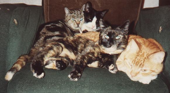 Unrelated cats may gang together to defend themselves or their territory against intruders. On one occasion I was woken by Aphrodite and Sappho (twice Aphrodite's age and unrelated); between them they had cornered an opportunistic cat which had come in through the cat flap. Aphrodite guarded one end of the long hallway, Sappho guarded the other end and they played 'ping-pong' with the youngster until I rescued and evicted him.