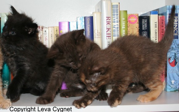 Above are black (smoke), solid chocolate and chocolate tortie kittens. The black is shown for colour comparison. Chocolate and choc-tortie are more common in pedigree cats than in randombreds, but these kittens were born to non-pedigree parents. Photo courtesy of Leva Cygnet.
