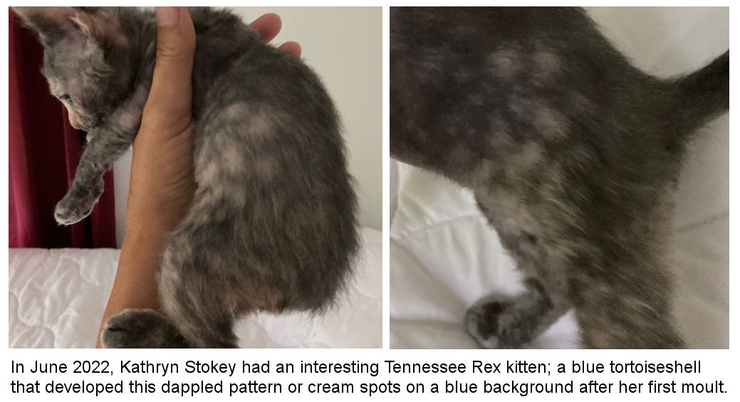 In June 2022, Kathryn Stokey had an interesting Tennessee Rex kitten. She is blue tortoiseshell, her father is solid blue and her mother is solid cream (DNA tested non agouti). Her initial kitten coat comprised intermingled blue and cream hairs without distinct patches. After moulting, the kitten's fur has formed perfect cream spots on a blue background, something I'd never seen previously.
