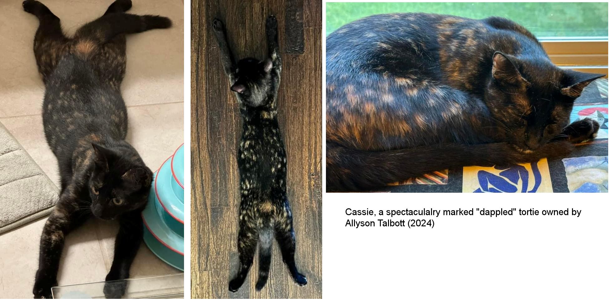 Also in 2024, Allyson Talbott shared a photo of a "dappled" tortie named Cassie, who has red dapples on a black background.