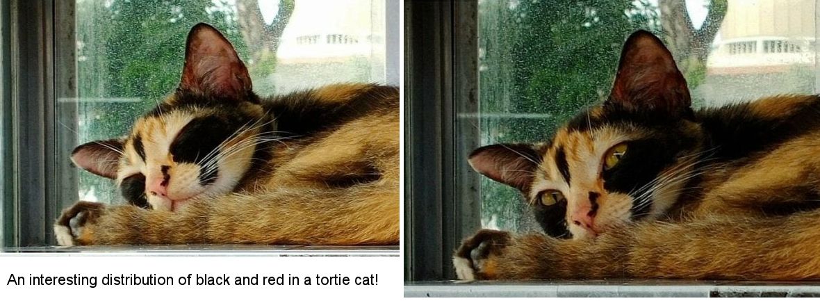 This is what is happening when a tortoiseshell female is mated to either a red or a black male. Because a tortie female is heterozygous, she can pass on either the gene for red or the gene for non-red (black). The colour of the kittens depends on whether they are male or female and what gene, if any, they inherit from the male.