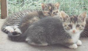 Ticked tabby also occurs in randombred cats, in which case there may also be white markings, resulting in "ticked tortie tabby and white" (ticked calico). The photo shows part-Abyssinian tortoiseshell ticked tabby kittens with white.