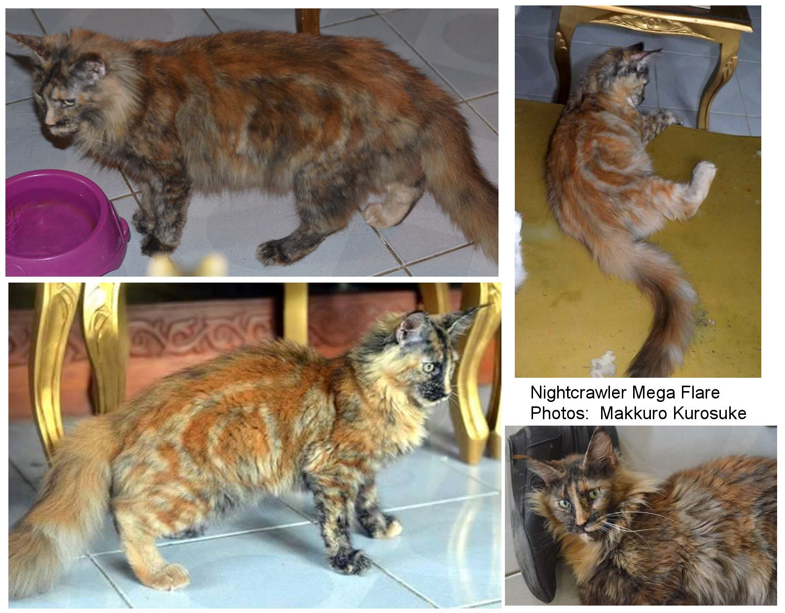 This is Nightcrawler Mega Flare ("MegMeg"), a tortoiseshell Maine Coon belonging to Makkuro Kurosuke in Brunei. Her sire is solid black and her dam is a blue tortie smoke with white. The pictures show how the O gene does not let the non-agouti gene work ao the red colour always shows some degree of pattern even if the cat is genetically non-agouti (solid colour). Because of this, in the red areas, Mega shows the classic tabby pattern. It's a visually stunning effect.