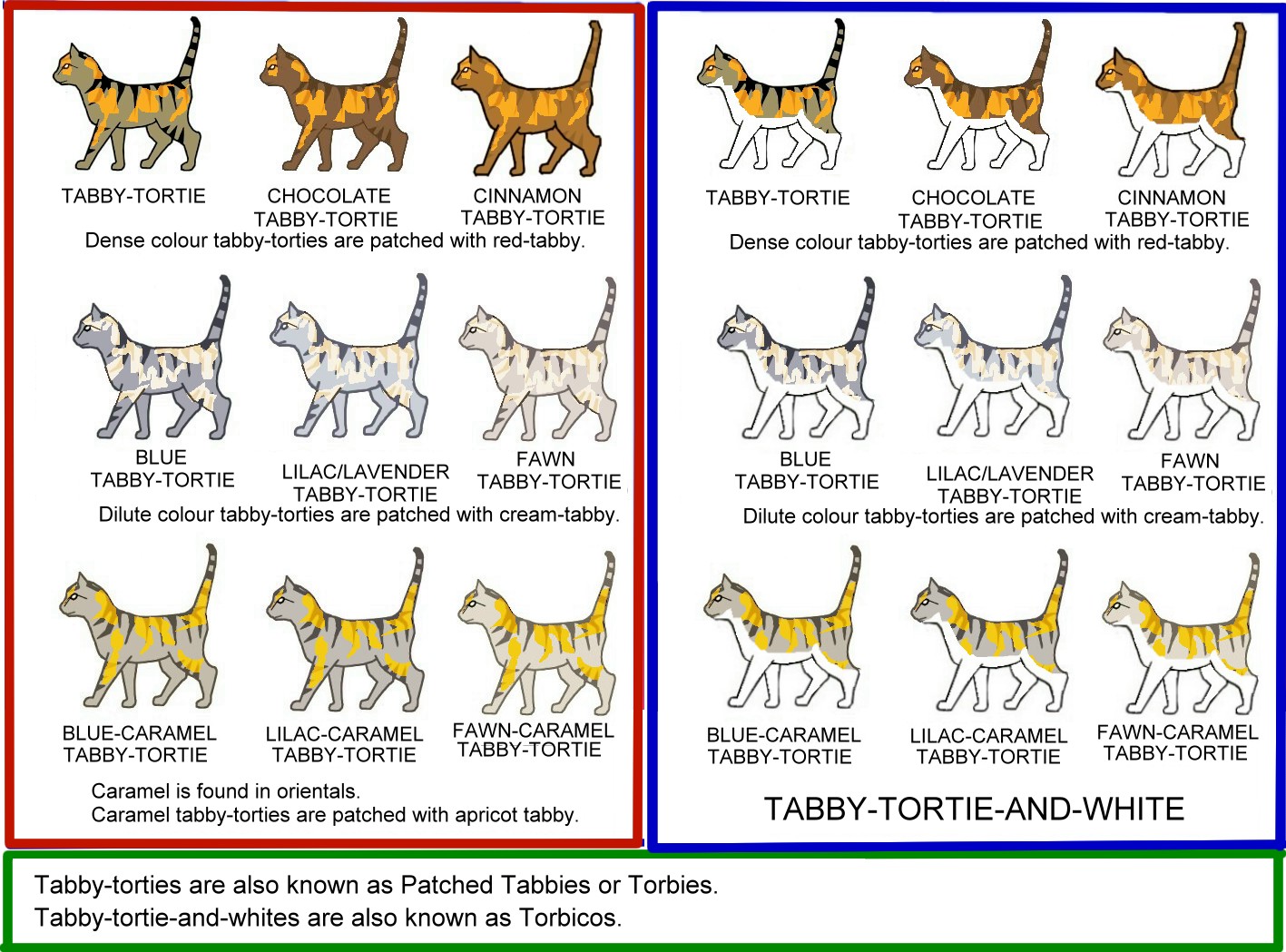 The basic tortoiseshell combination is black and red. The addition of the dilution gene gives rise to the other tortoiseshells combinations. In Burmese cats, where there is a different dilution gene at work, diluting black into brown. Caramel colours (a modifier of dilute colours) may be visually indistinguishable from other colours, and only known to be caramel based on the cat's pedigree. The table is are based on solid colour cats.