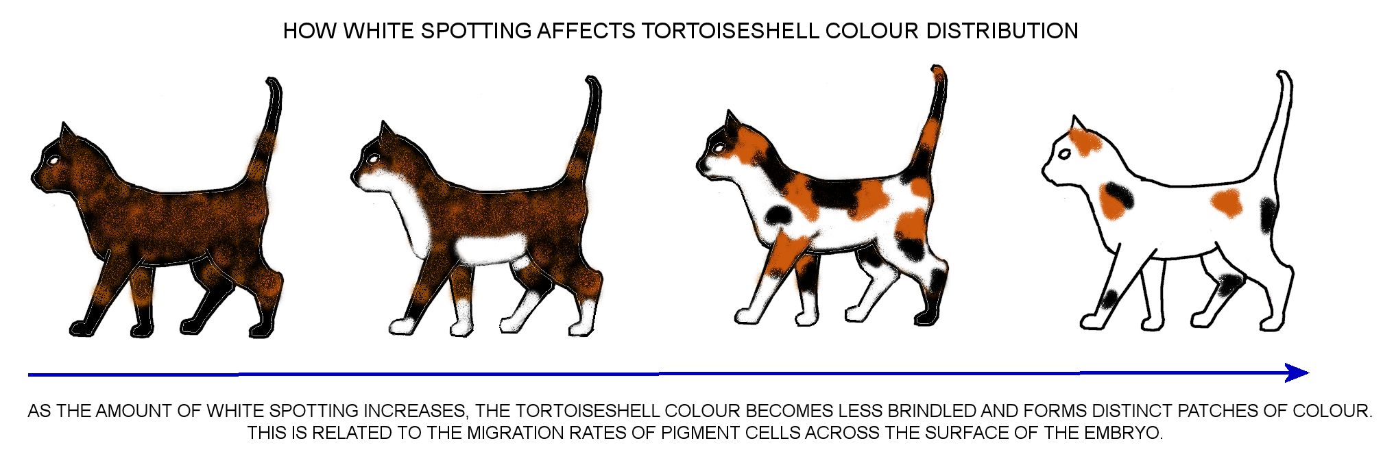 The white patches in tortie-and-white (tricolour, calico) cats is caused by the piebald spotting gene discussed in Beautiful Bicolours. This is a dominant gene with very variable expression ranging from nearly all white to nearly all coloured with only a few white hairs. The gene affects the embryo cells which will become pigment-producing skin cells. These cells are initially formed along the "neural crest" (embryo's backbone area) and migrate across the body during formation of the skin. Where these pigment producing cells fail to get in position before the skin is fully formed, there are areas of skin which lack pigment producing cells; usually the areas furthest from the cat's backbone - paws, belly, chest and chin - as these areas take longest to reach. One effect of white spotting in tortoiseshell cats is to change the pattern from intermingled to patched. Tortie cats with little or no white tend to have brindled coats. However, the more white there is, the more the black and white will also be separated out into patches instead of being intermingled. The phenomenon of tortie-and-white cats having better defined patches of colour is familiar to most cat lovers.