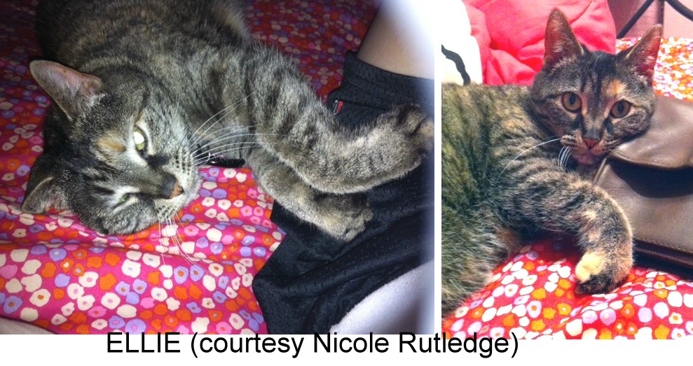 Nicole Rutledge (2013) has a 3 year old domestic shorthair female named Ellie. Ellie was adopted from a local animal shelter and the first thing most people notice are her big eyes rather than her twisted forelegs. Ellie has bilateral twisted forelimbs. She walks a little oddly; scooting her front limbs instead of picking them up. However, she's a very happy and healthy cat with only minor mobility issues. The only medical problem it has caused is with her claws. Ellie cannot use them like normal cats and can’t naturally file them down by scratching. Nail trimming was not an option, due to the fact she doesn't Nicole to handle her paws. This resulted in her claws overgrowing into her pads. The only option was declawing, which Nicole does not otherwise support, except where it is medically necessary and a last resort. Without the problem of claws overgrowing, Ellie is more comfortable shuffling around. Because Ellie has adapted and is in no way crippled, there is no need for invasive surgery to straighten the legs. Nicole says it’s sad that many people choose euthanasia for cats like Ellie “deformities are beautiful, and I wouldn't have her any other way.”