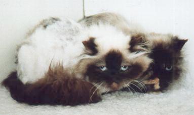 The Siamese once resembled a shorthair with coloured points. It was chunkier than the modern fragile-looking Siamese with their ultra-tubular shape, ultra-wedge-shaped face and ultra-slim legs which arose through selective breeding for an extreme foreign shape. Although both types are said to occur naturally, breeders have worked to 'refine' the Siamese. According to an American breeder of traditional style Siamese cats, the CFA Siamese breed council actually changed the definition of a Siamese cat so that the original cat can no longer be shown because it does not meet the revised breed standard. The new definition not only encourages, but actually drive the breeders to produce an even more extreme animal than was current when the standard changed. The natural Siamese/Oriental cats I have found in Thailand and Malaysia are not cobby like European cats, but they are nowhere near as extreme as the modern show-quality Siamese, so I am convinced that this "refined" style is an invention of the breeder.