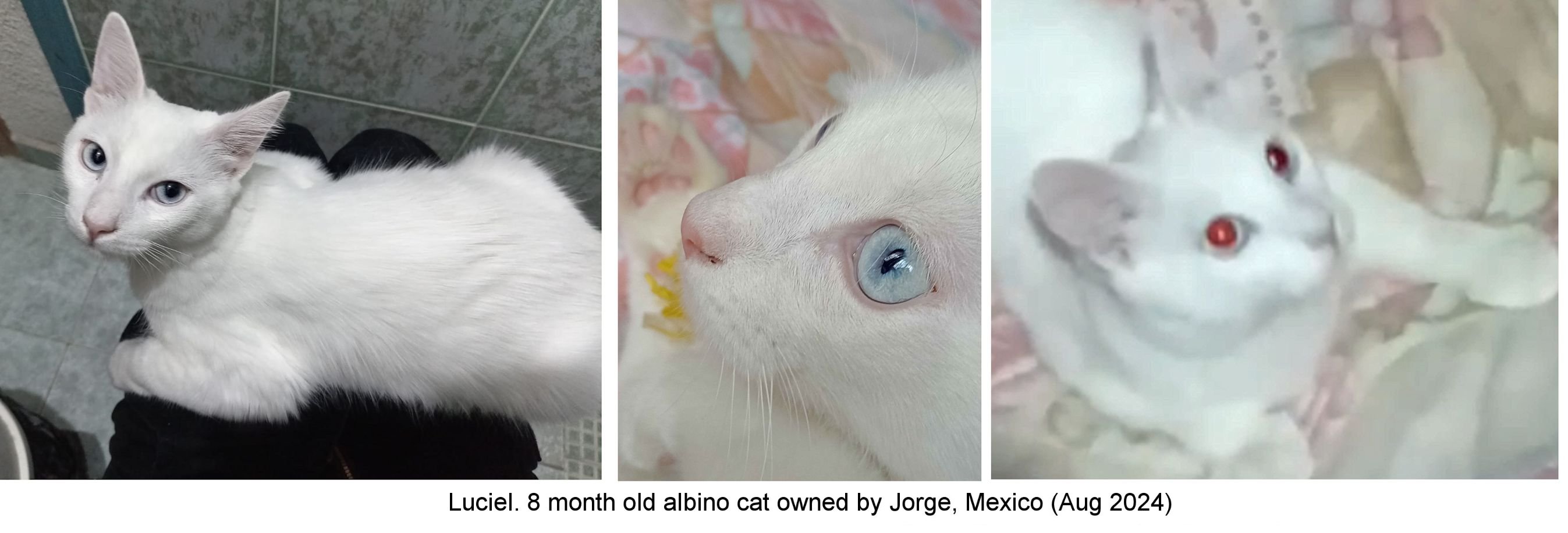 Jorge, from Mexico, sent me photos of his 8 month old cat albino cat Luciel who was adopted randomly. Luciel has very pale blue eyes that reflect red instead of green. He has no spots of any colour, his skin is a light pink everywhere and you can see his blood vessels in his ears in the sun (he is kept out of the sun as much as possible to prevent sunburn).