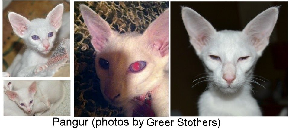 Albinism has spread from the Siamese to closely related Oriental breeds. Greer Stothers sent me this report of an albino cat in 2013. Pangur is an oriental longhair with very pale skin and nose. Her paw-pads and ears, are pink-tinted white threaded through with red veins. Her eyes look like faded lilac-blue (Greer describes it as an Elizabeth Taylor colour) and when you look closer, you can see that the pupil is a dull red, while what looks like lilac is just the pale blue refraction of the lens overlaid on more red. You can very clearly see the blood vessels beneath the iris which can be a bit creepy, because when the light hits Pangur in the right way, her entire eye turns a muted pinkish red. In the dark, they reflect bright red.